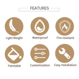 ● PU Cornice Moldings is an elegant, fashionable, decorative material. It is mainly made of high-quality polyurethane material, making it stronger and lighter than gypsum powder eaves. This high-quality material can be used for interior decoration in high-end buildings such as hotels, restaurants, shopping malls, theaters, dance halls, cinemas, stations, auditoriums, offices, living rooms, commercial buildings, and industrial or residential buildings.
