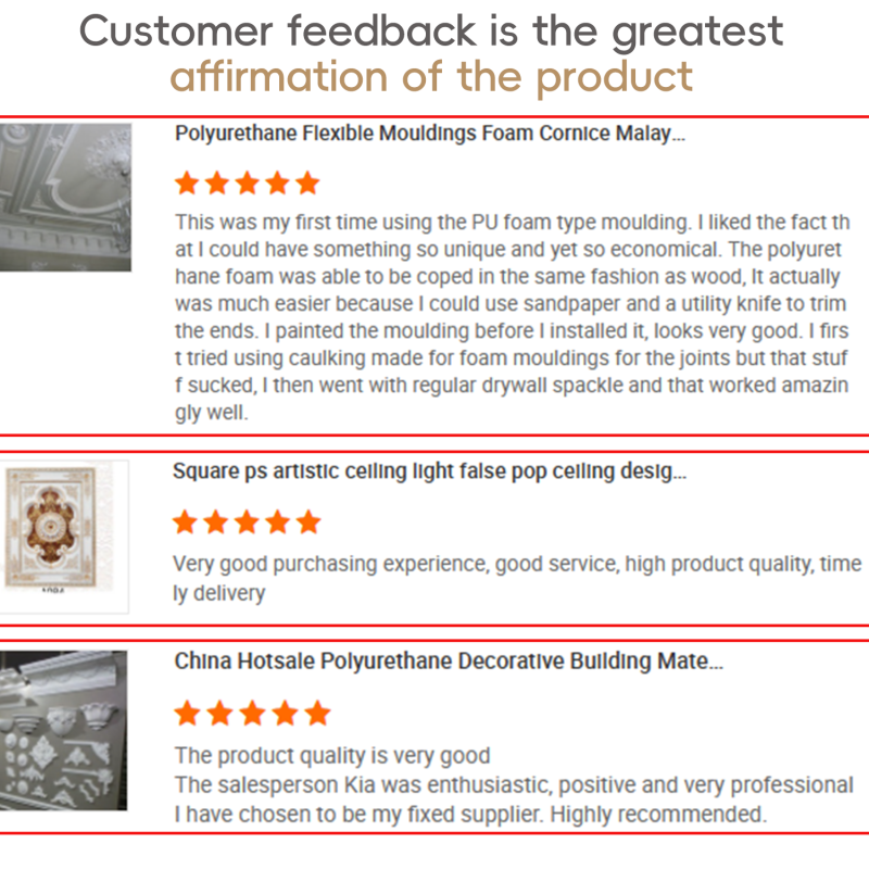 ● PU Plain Crown Molding is an elegant, fashionable, decorative material. It is mainly made of high-quality polyurethane material, making it stronger and lighter than gypsum powder eaves. This high-quality material can be used for interior decoration in high-end buildings such as hotels, restaurants, shopping malls, theaters, dance halls, cinemas, stations, auditoriums, offices, living rooms, commercial buildings, and industrial or residential buildings.